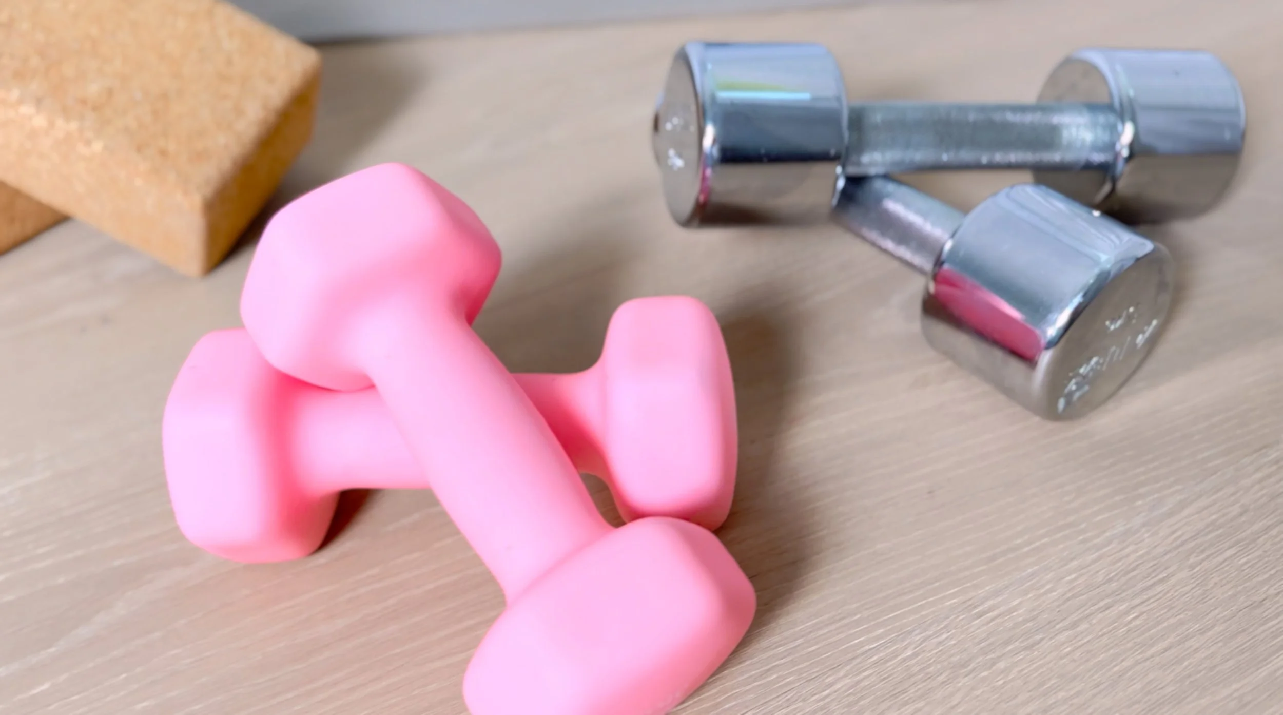 Du brauchst eine Yogamatte, ein Paar Hanteln (je nach Trainingslevel), eine Flasche Wasser – und wenn du möchtest, Yoga-Blöcke zur Unterstützung in den Dehnübungen.